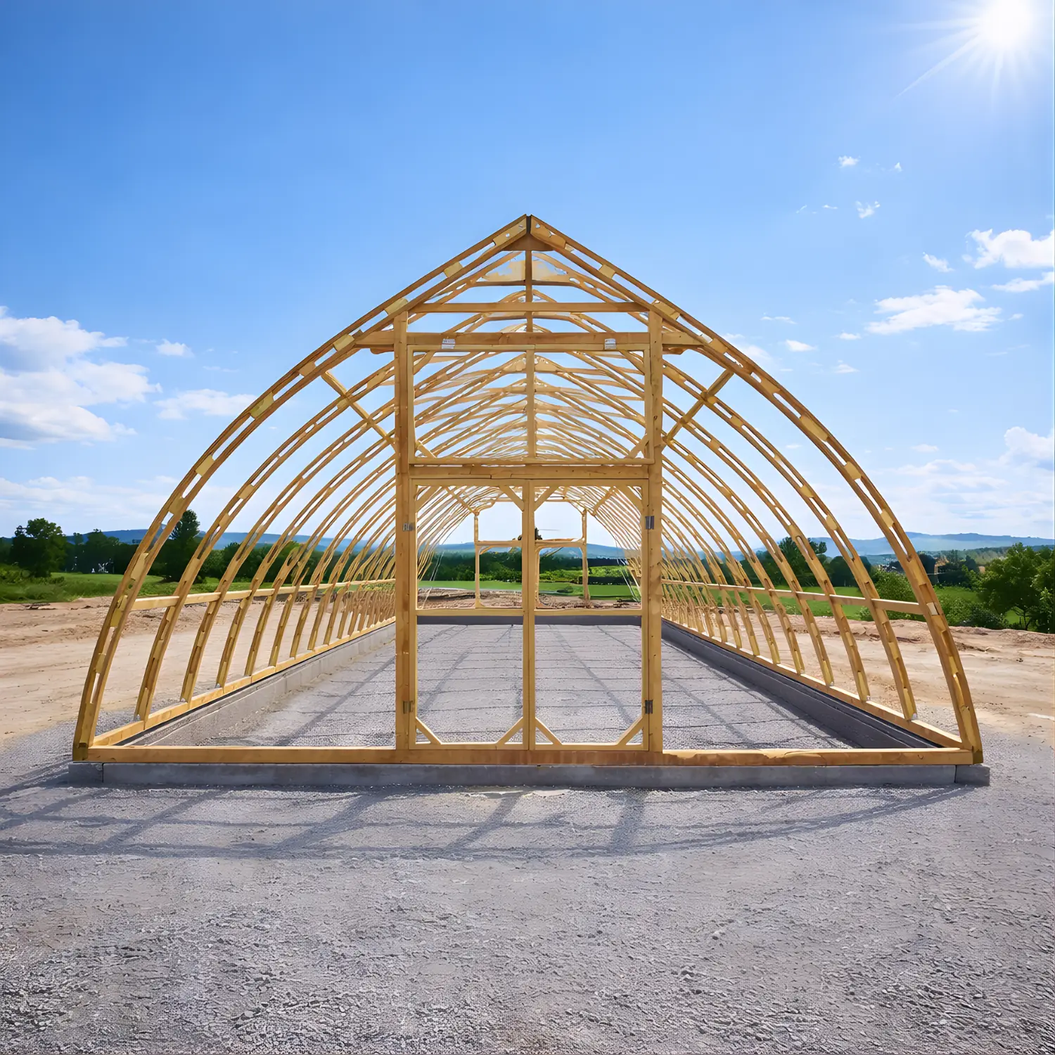 Der Sockel, die horizontalen Verbindungsbalken, die Frontpartie, die Türen und die Fenster des Gewächshauses bestehen aus hochwertigem schwedischem Kiefernholz, das für Langlebigkeit und eine natürliche Optik sorgt. Die Bögen bestehen aus stabilem Sperrholz und bieten eine robuste und zuverlässige Konstruktion, die verschiedenen Witterungsbedingungen das ganze Jahr über standhält.